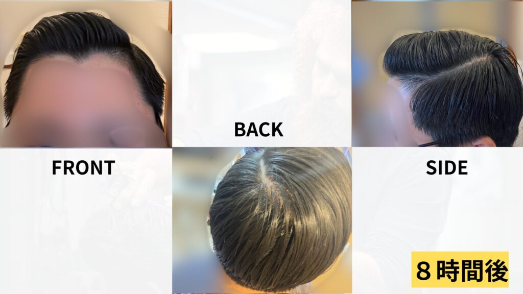 水を少量つけてコームを通すだけでほぼ元のスタイルに戻せるため、再整髪性は非常に高い。