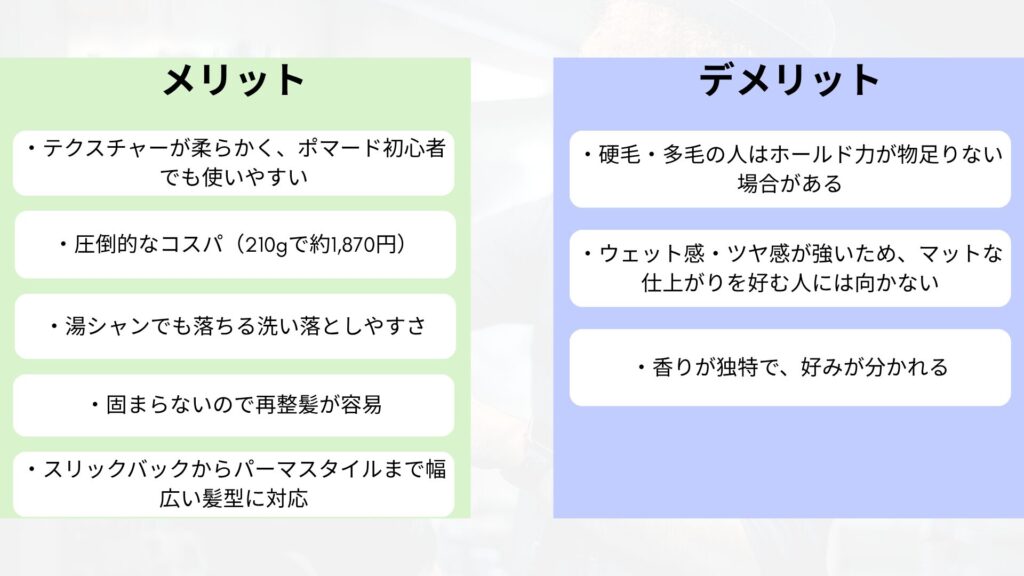 他のメーカーのポマードと比較し香りの特徴は薄いものの、使いやすさとコストパフォーマンスを両立させた、高品質なポマードである。